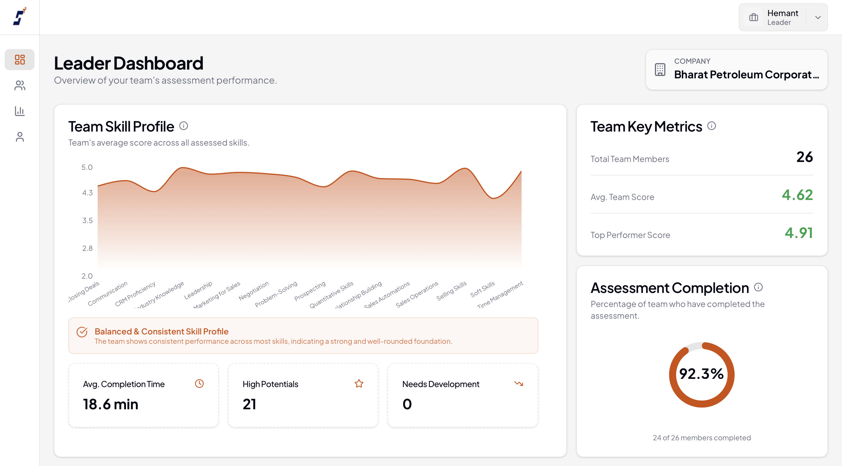 The moment assessment is complete, reps and managers access their comprehensive reports. No waiting weeks for PDFs—live, interactive dashboards show scores, rankings, strengths, weaknesses, and trends.